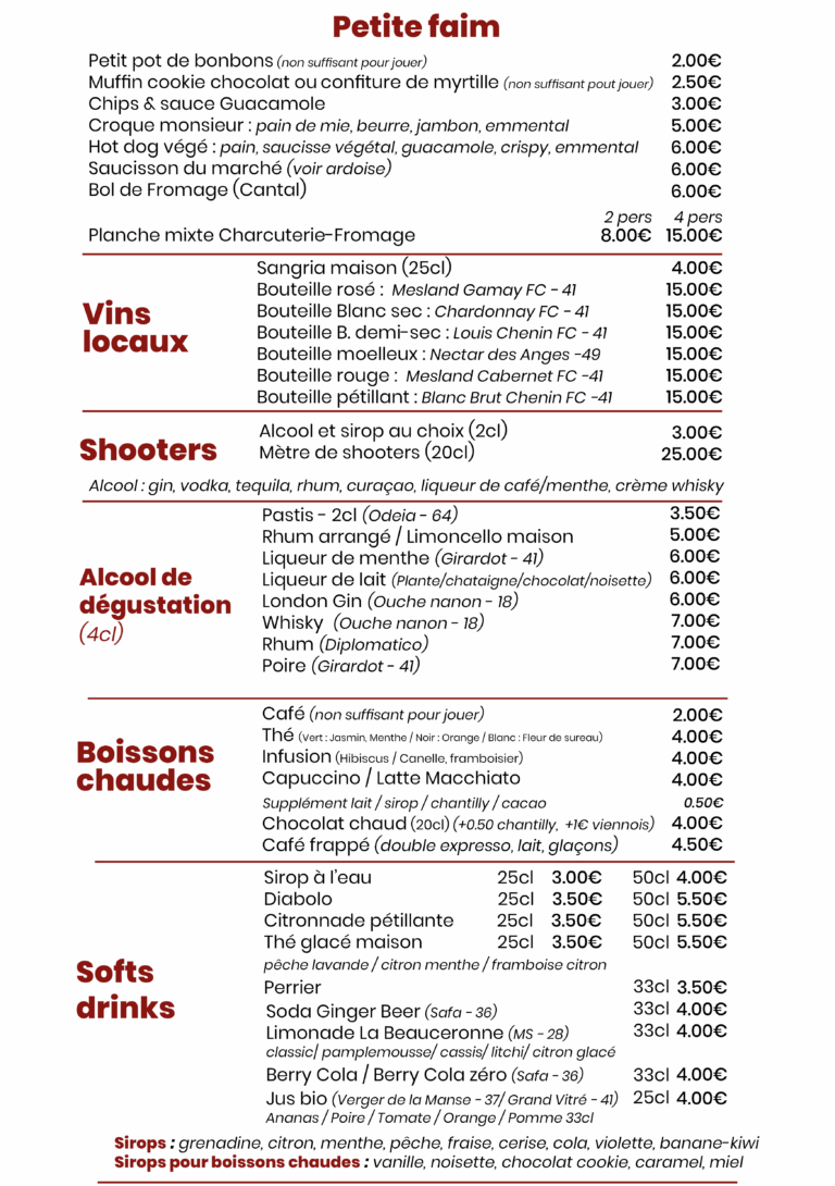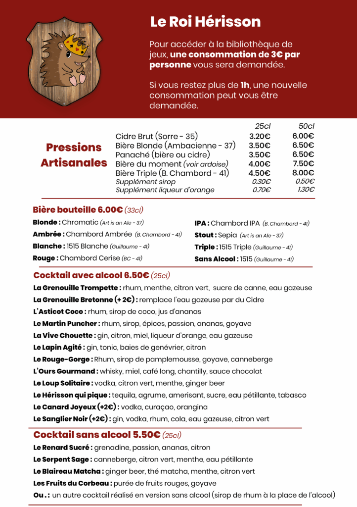 Concept : Arrivé dans le bar à jeux, vous pourrez vous installer, commander votre boisson. Ensuite faites votre choix dans la bibliothèque des jeux. Mais n’hésitez pas à demander conseil ! Car le(s) serveur(s), également animateur(s) de jeu, pourront vous guider.